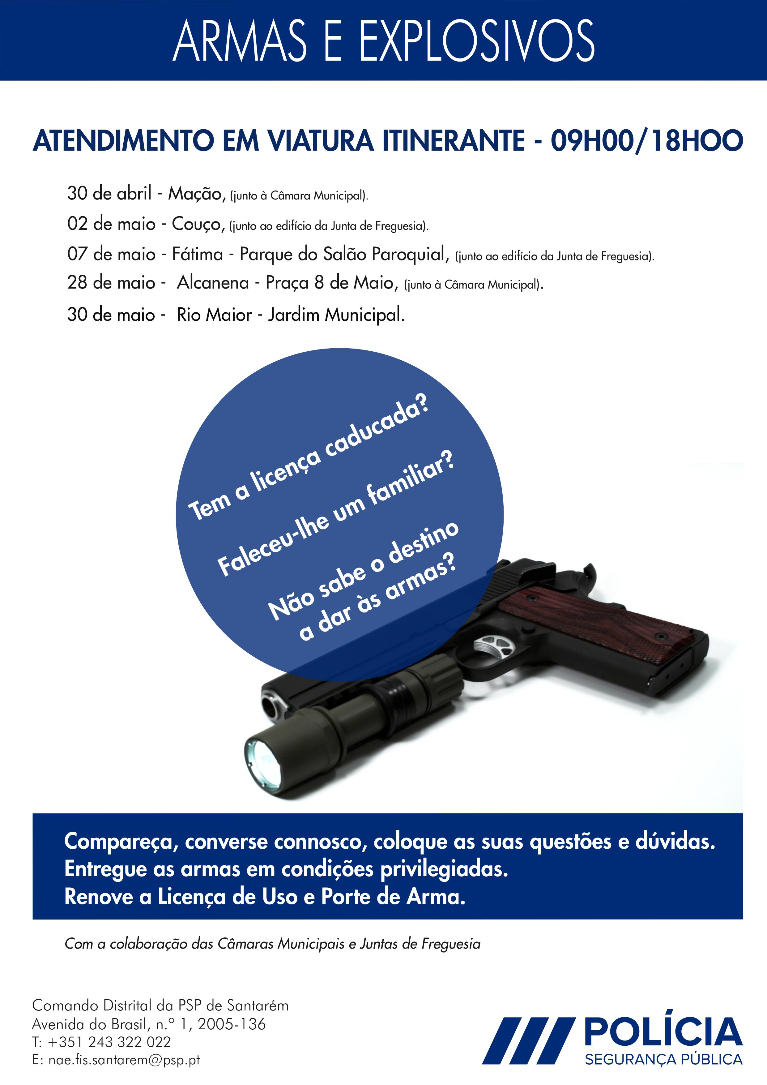 No dia 7 de maio entre as 9h e as 18h , no Parque do Salão Paroquial, irá estar uma viatura itinerante da PSP com agentes de autoridade a responder às questões / dúvidas relacionadas com armas e munições.