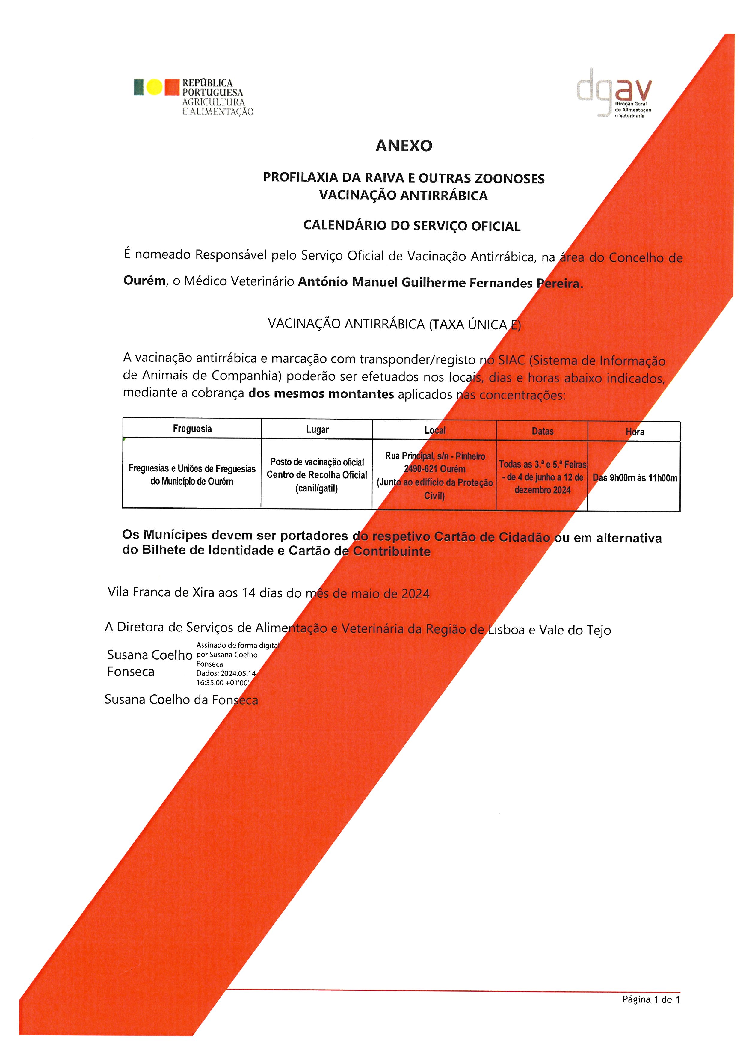 O veterinário do Municipio de Ourém não se deslocará às várias freguesias do concelho mas estará no posto de vacinação oficial (Centro de Recolha Oficial Canil/Gatil) em Ourém, junto ao edificio da Proteção Civil, no Pinheiro, todas as terças e quintas feiras (de 4 de junho a 12 de dezembro de 2024), das 9h00m às 11h00m.